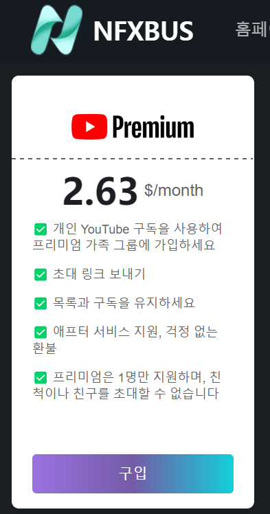 NFXBUS 라는 OTT 쉐어 사이트가 있습니다. 여러 명이 함께 계정을 공유해서 구독료를 절감하는 플랫폼인데요. 12개월 + 4개월 구독권을 선택하면 총 16개월 동안 월 3,000원대로 이용할 수 있습니다. 가족과 함께 유튜브 프리미엄을 경제적으로 이용할 수 있는 좋은 방법입니다.