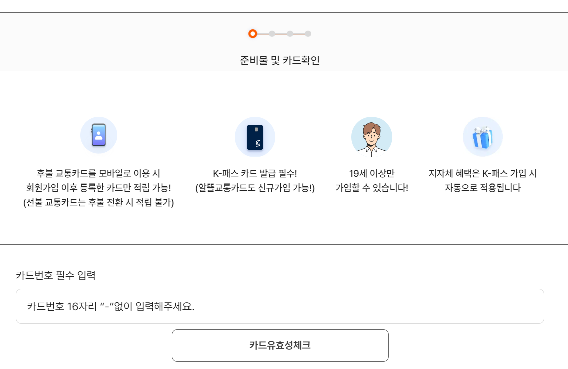 카드사에서 카드를 발급 받은 후에는 K패스 회원으로 가입해야 합니다. 이때 발급받은 카드를 꼭 등록하세요. 회원가입 없이 사용하게 되면 포인트를 적립받을 수 없으니 반드시 이 절차 놓치지 말고 해야 합니다.